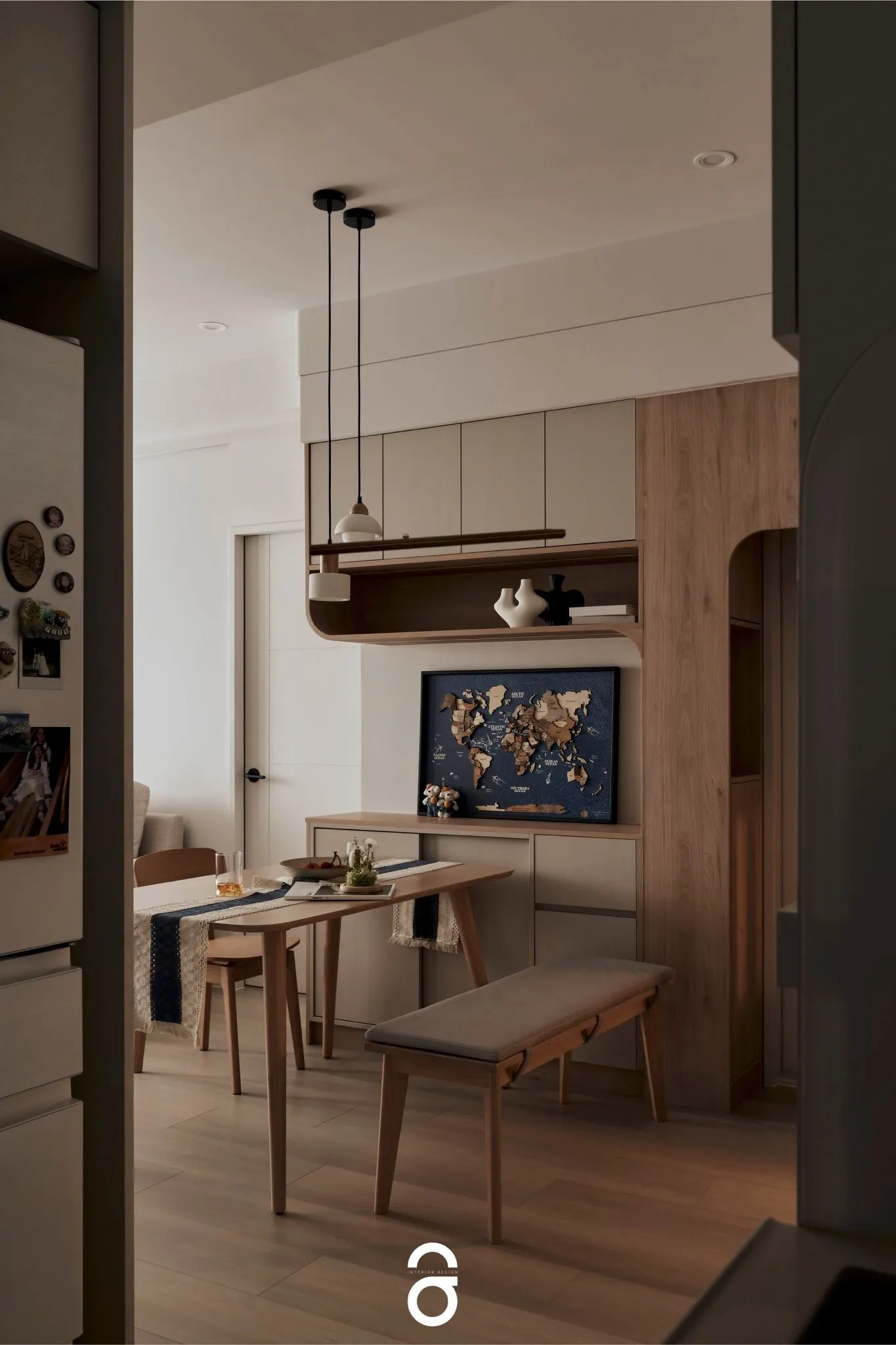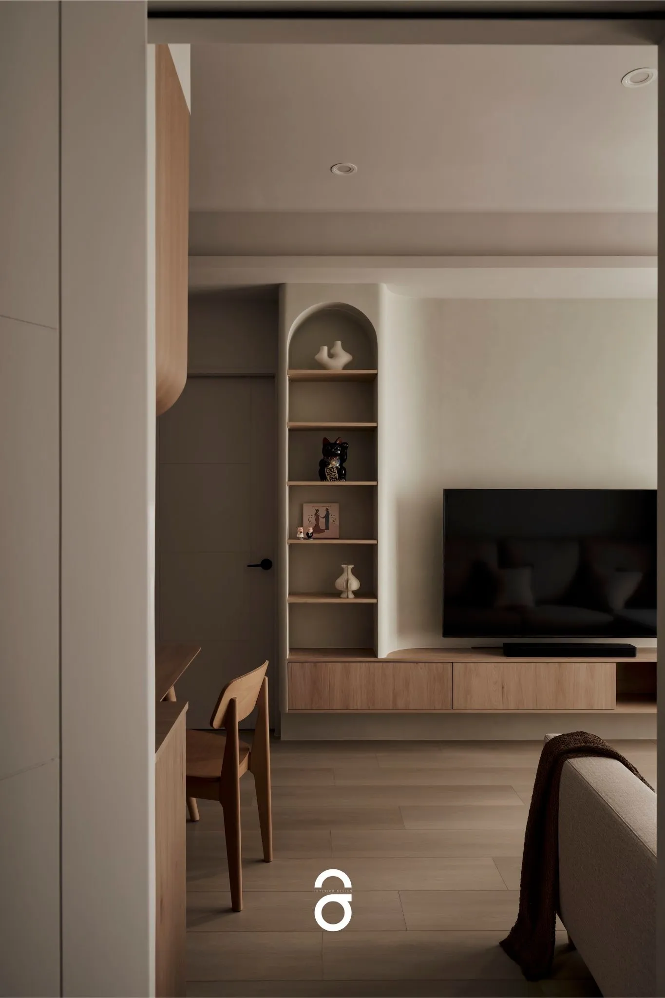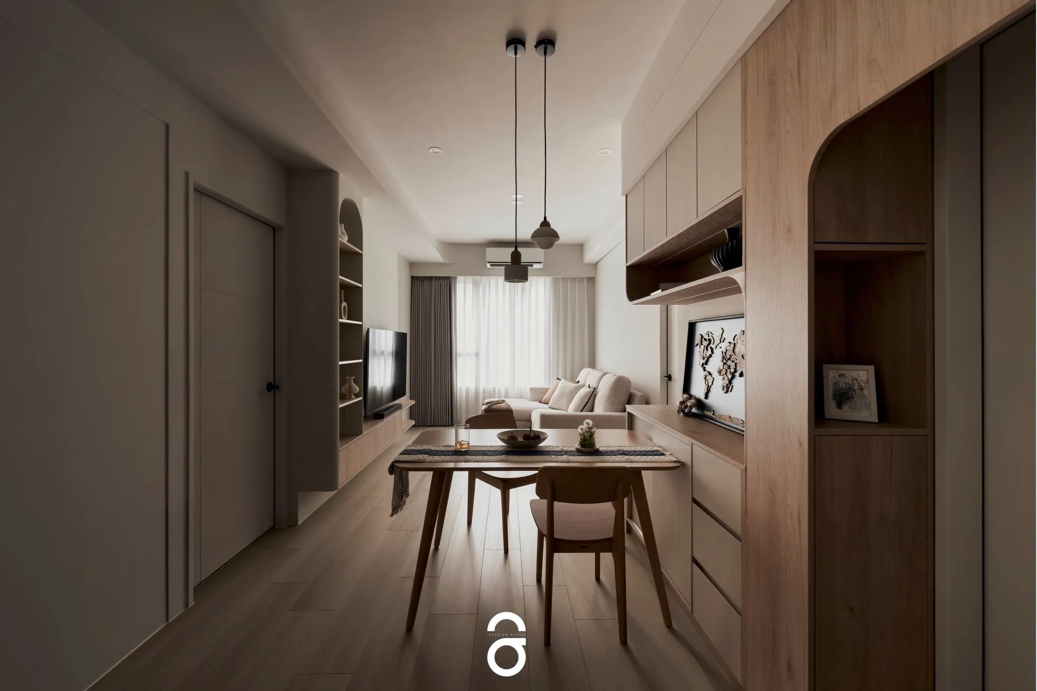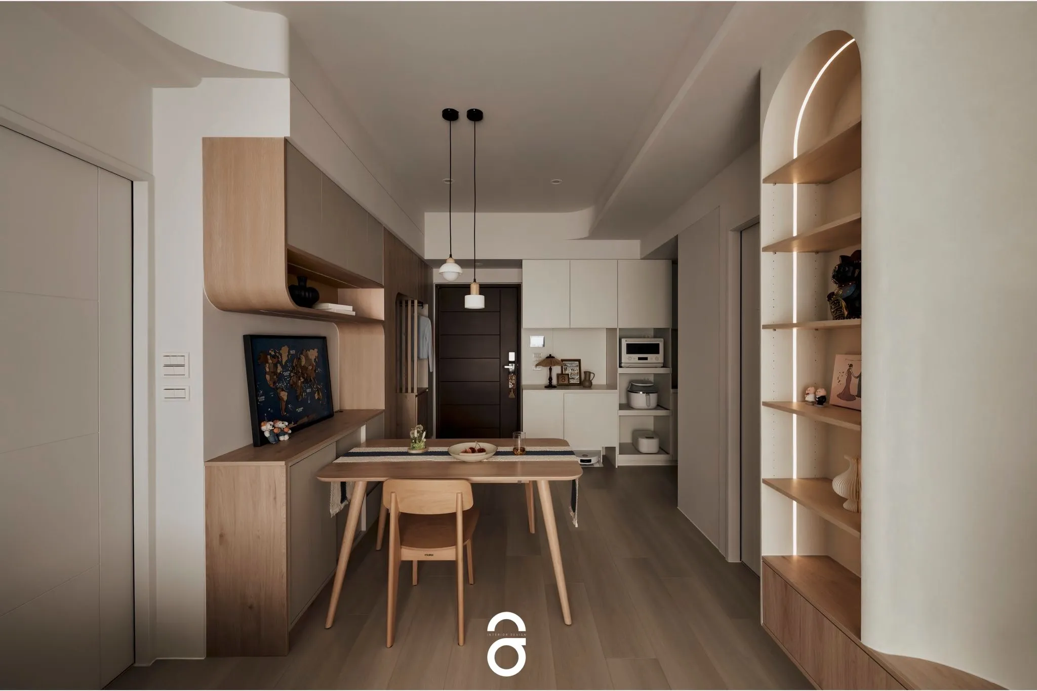 午後的光靜靜灑落,映著兩人生活的節奏,在這座小宅裡,日常自有它的風景。 光影在木色與白牆間流動, 柔和了空間,也柔和了生活的步調。 這個空間為一對夫妻量身打造,以「簡約舒心、溫潤木色」作為主軸, 透過流暢動線與完整收納,讓15坪的小宅也能自在呼吸。 在不浪費每一吋空間的同時,也留給生活從容與光影穿梭的餘地。 設計亮點 。整合式餐廚:開放空間讓餐桌成為家的核心,串連生活動線 。柔光調性:淺灰×溫木色×白,構築靜謐氛圍 。高效收納:入口與公領域以立面收納串連,保持整潔視覺 ——— 空間資訊 設計風格:日式北歐×溫潤留白 裝修性質:新成屋空間坪數:15坪居住成員:夫妻兩人 設計總監:UNA