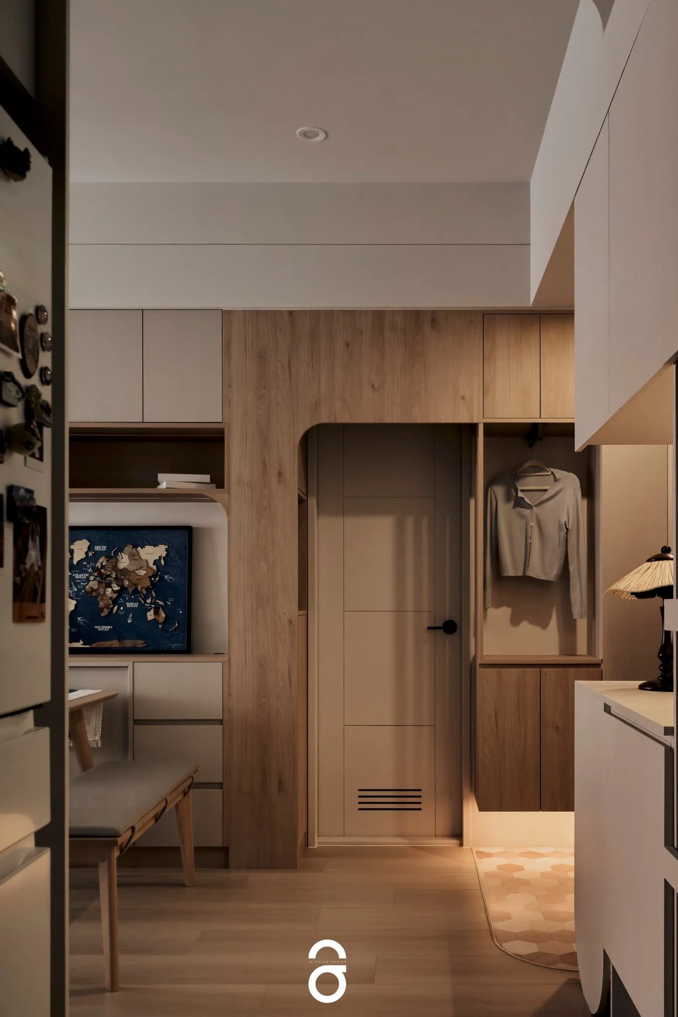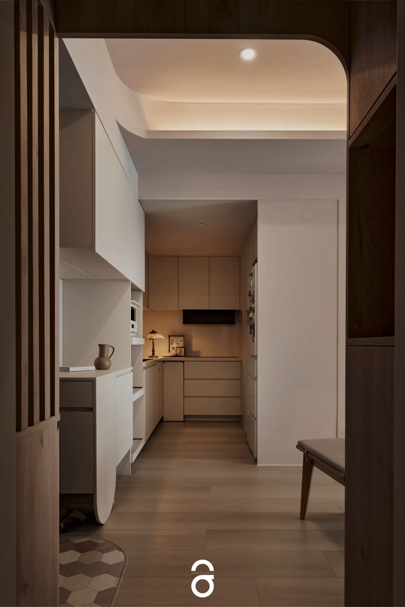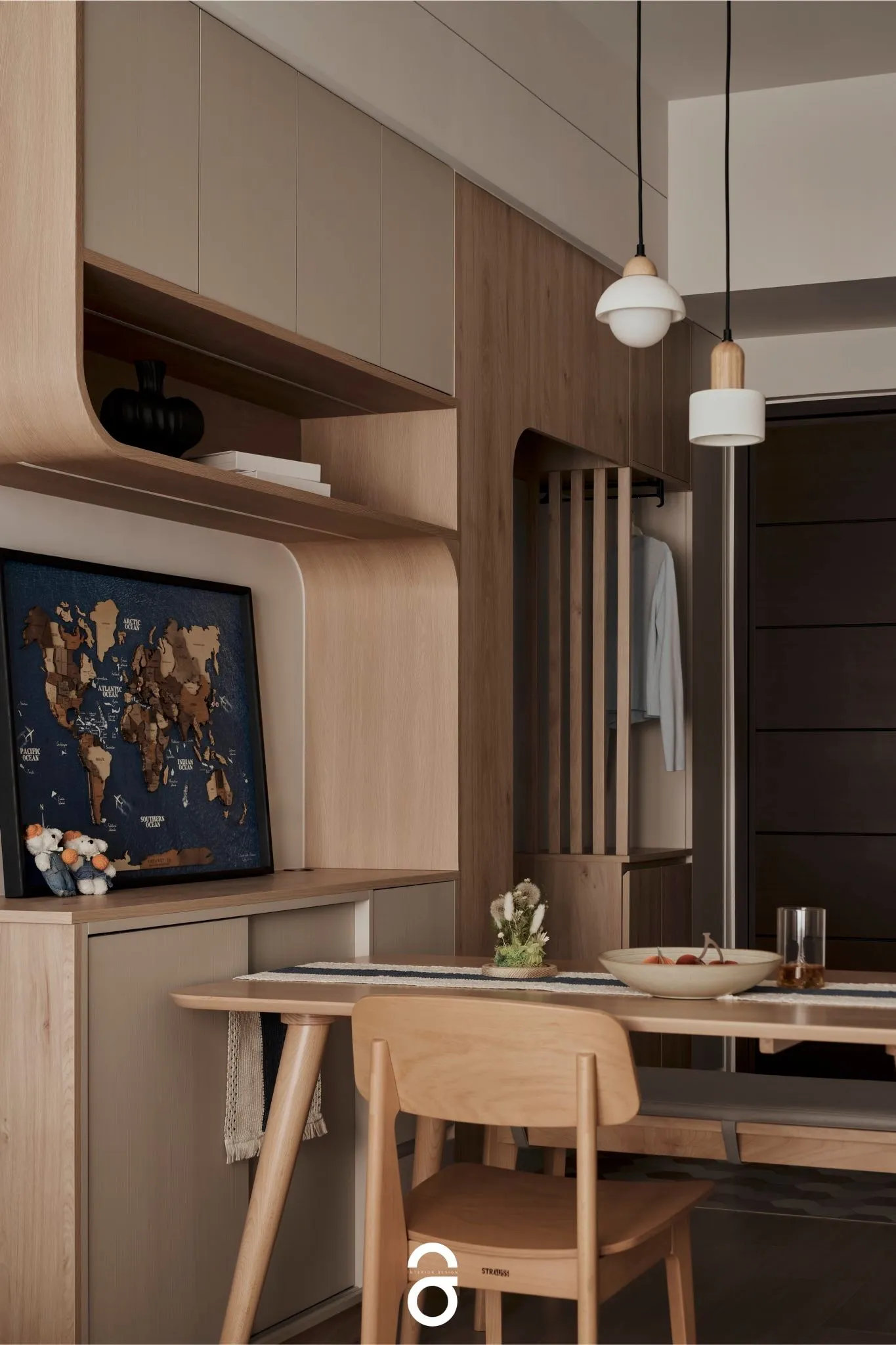 午後的光靜靜灑落,映著兩人生活的節奏,在這座小宅裡,日常自有它的風景。 光影在木色與白牆間流動, 柔和了空間,也柔和了生活的步調。 這個空間為一對夫妻量身打造,以「簡約舒心、溫潤木色」作為主軸, 透過流暢動線與完整收納,讓15坪的小宅也能自在呼吸。 在不浪費每一吋空間的同時,也留給生活從容與光影穿梭的餘地。 設計亮點 。整合式餐廚:開放空間讓餐桌成為家的核心,串連生活動線 。柔光調性:淺灰×溫木色×白,構築靜謐氛圍 。高效收納:入口與公領域以立面收納串連,保持整潔視覺 ——— 空間資訊 設計風格:日式北歐×溫潤留白 裝修性質:新成屋空間坪數:15坪居住成員:夫妻兩人 設計總監:UNA