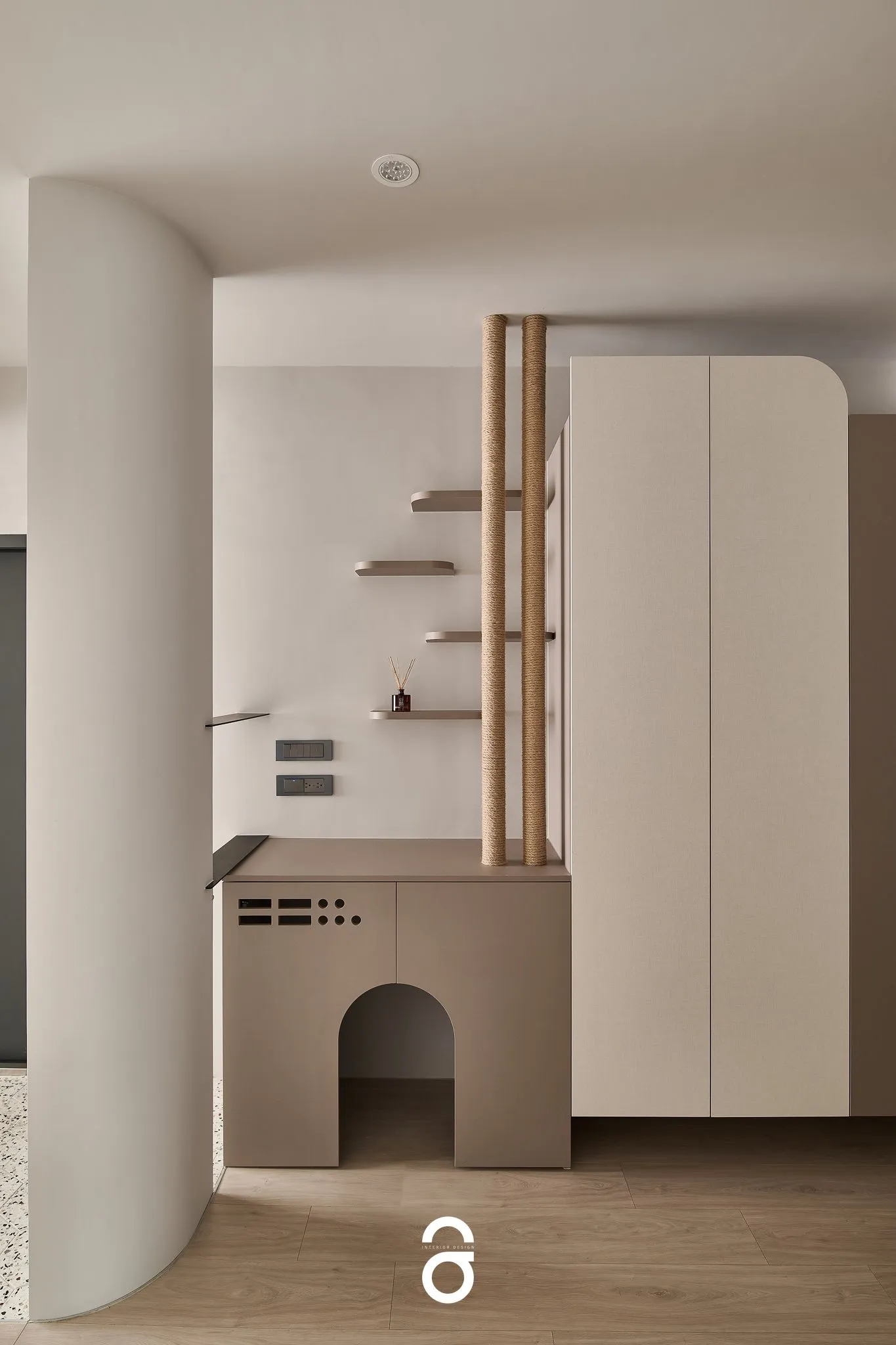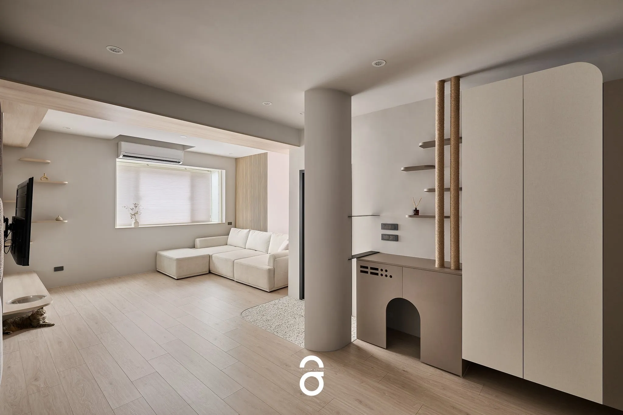 我們相信, 真正的設計不是用來佔據空間, 而是——讓生活,自在地呼吸。 本案是我們為「人與貓」共同生活量身打造的棲居之所, 將跳台、貓柱與收納整合在空間節奏裡, 留下足夠的留白,讓陽光與視線自由流動。 在這裡,沒有張揚,只有剛剛好的溫度與陪伴。 歡迎走進《設計在呼吸・貓系空間》。 在設計語彙中,我們放慢步調—— 用溫潤曲線減少銳利衝突、以低彩柔光烘托光影的寧靜, 更藏入一點點貓咪的趣味巧思, 讓生活,有了溫度與陪伴的形狀。 寢室|無壓的極簡風,讓日常更輕盈 主衛浴|粉橘磁磚搭配圓弧浴缸,泡澡像是一場柔和的儀式 客廳|線條與留白交織的安靜舞台 廚房|高收納、高機能,藏不住的生活美學 寵物天地|貓跳台 x 磨爪柱,家的設計也照顧毛孩的心 — 設計風格|柔霧米灰 × 木質調 × 光線流動 設計概念|極簡不空虛,留白不寂寞 生活導向|空間依著習慣而生,而非反之 裝潢類型|老屋翻新 空間坪數|25坪 設計總監|UNA